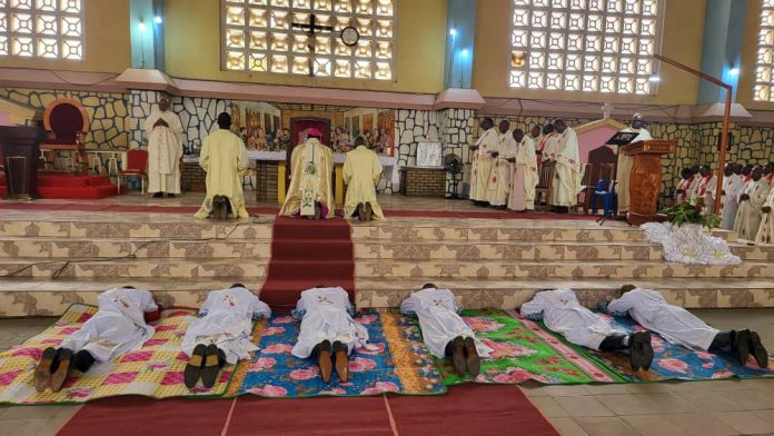 Lors de l’imposition des mains sur les futurs prêtres, l’évêque le transfert l’autorité de Dieu et le pouvoir du saint esprit au nouveaux pasteurs. Durant la célébration comme il en est de coutume, les 6 futurs prêtres se sont allongés devant l’évêque, visages au sol.