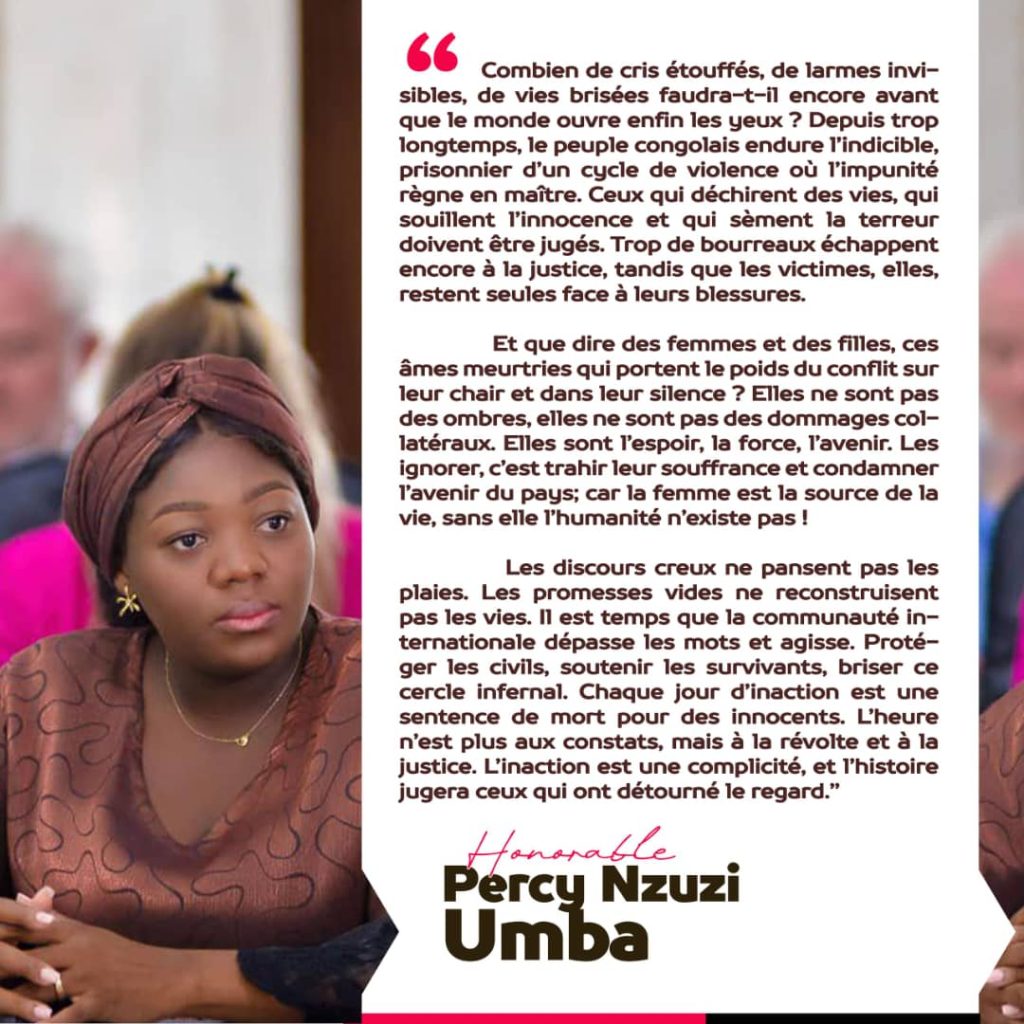 « combien de cris étouffés, de larmes invisibles, de vies brisées faudra-t-il encore avant que le monde ouvre enfin les yeux ? Depuis trop longtemps, le peuple congolais endure l’indicible, prisonnier d’un cycle de violence où l’impunité règne en maître. Ceux qui déchirent des vies, qui sèment la terreur doivent être jugés. Trop de bureaux échappent encore à la justice, tandis que les victimes, elles, restent seules face à leurs blessures, … »