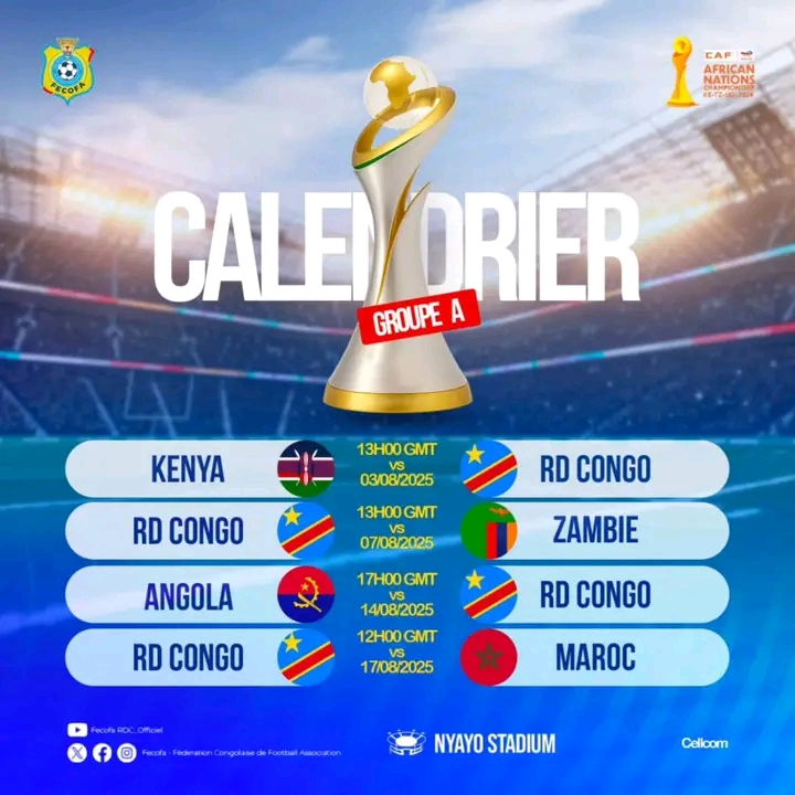 La Fédération Congolaise de Football et Associations (FECOFA), a rendu public le calendrier de participation des léopards durant la phase des groupes.